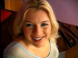 Une salope aux cheveux dorés et aux seins montre son biscuit et suce une bite sur le canapé puis copule,